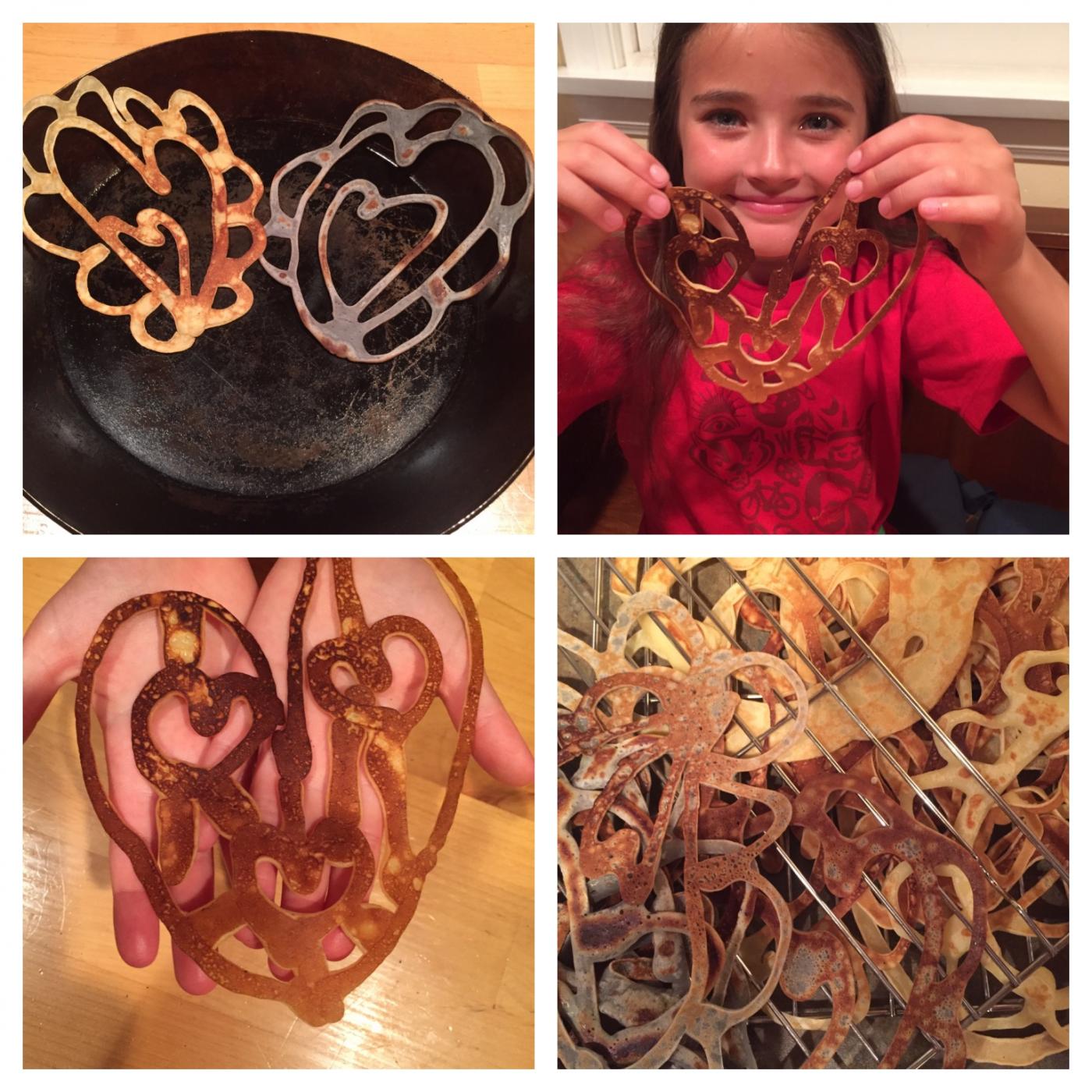 Batters should not be over-beaten, but anybody who ever made a pound cake or pancake knows that. For pancakes, always have enough batter to throw the first ones out (or, in my case, eat them right out of the pan). The pans must be evenly heated through, and good, heavy pans need a while. The technical side of baking I really love. But when it comes to questions of design -I am still learning. I was glad that my daughter (9) was there to help me out by making many of the hearts, and also piping a "center piece," which she is holding in her hands.